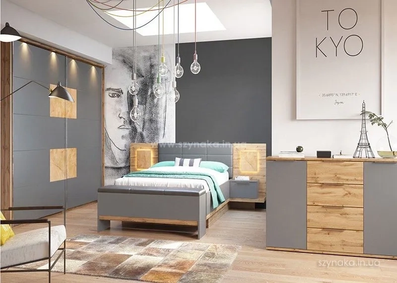 Основной спальный гарнитур, это кровать с прикроватными тумбочками. Кровати обычно доступны в трех размерах, 140, 160 и 180 см и могут быть дополнительно оснащены контейнером для постельных принадлежностей. Тумбы чаще всего бывают правого и левого исполнения, они подобраны под размеры кровати, вместе создают гармоничную композицию, являющуюся декоративным элементом спальни.
