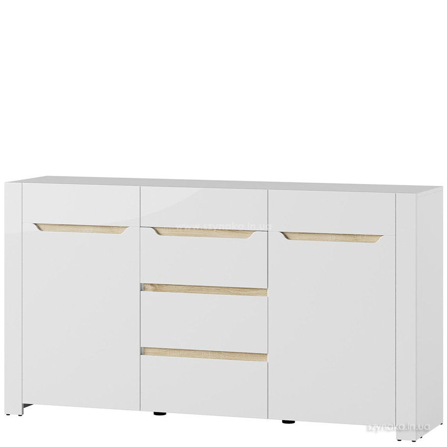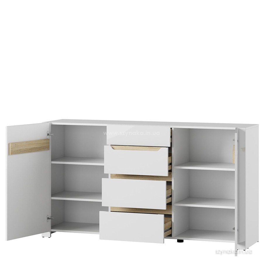 ICE 10 SZYNAKA Комод двухдверный модульной системы Айс ШИНАКА с четырьмя выдвижными ящиками. Для открывания используются оригинальные ручки-выемки. За каждой дверцей расположено по две полки. Применяется система тихого закрытия дверей и ящиков.