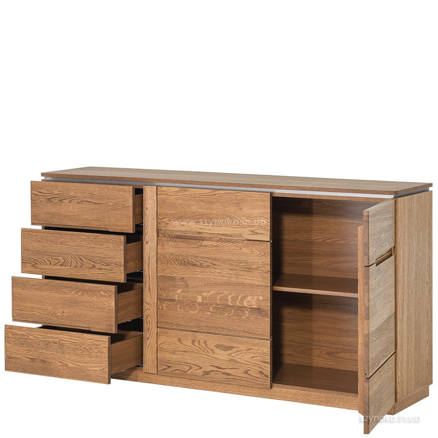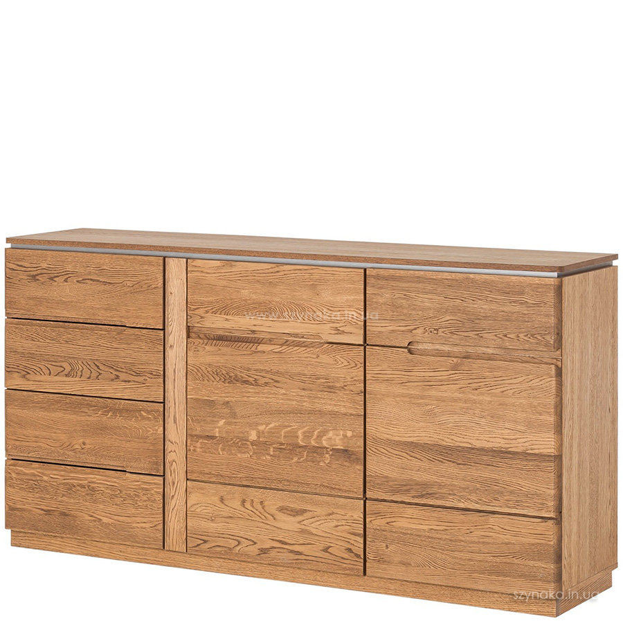 MONTENEGRO 45 SZYNAKA Комод двухдверный модульной системы Монтенегро ШИНАКА с четырьмя выдвижными ящиками. Декорирован горизонтальной металлической вставкой. За двумя распашными дверями расположена одна полка. Применяется система тихого закрытия дверей и ящиков.