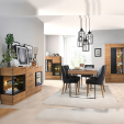 MOSAIC SZYNAKA Столовая модульной системы Мозаик ШИНАКА. Витрины и буфет оснащены закаленным стеклом в алюминиевой раме. Стеклянные полки можно дополнить подсветкой 3-L-BN-2-0000-01 3-L-BC-2-0100-01  или 3-L-BC-2-0400-02  на выбор. Задние стенки витрин и буфета декорированы оригинальным геометрическим узором. Двери и ящики оснащены системой тихого закрытия.