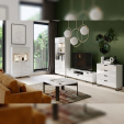 MEGAN 05 SZYNAKA Тумба ТВ двухдверная модульной системы Меган ШИНАКА с выдвижным ящиком и открытой нишей с отверстием для проводов в задней стенке. За каждой дверцей расположены вместительные отделени
